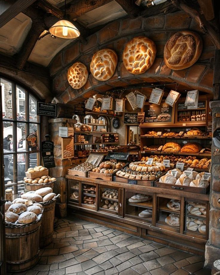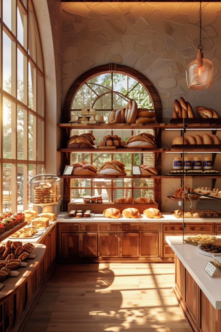 Kệ gỗ sồi cũ hoặc gỗ thông tẩm sáp, tủ trưng bày kính với khung gỗ dày, tạo cảm giác ấm cúng như một tiệm bánh ở vùng nông thôn nước Pháp.