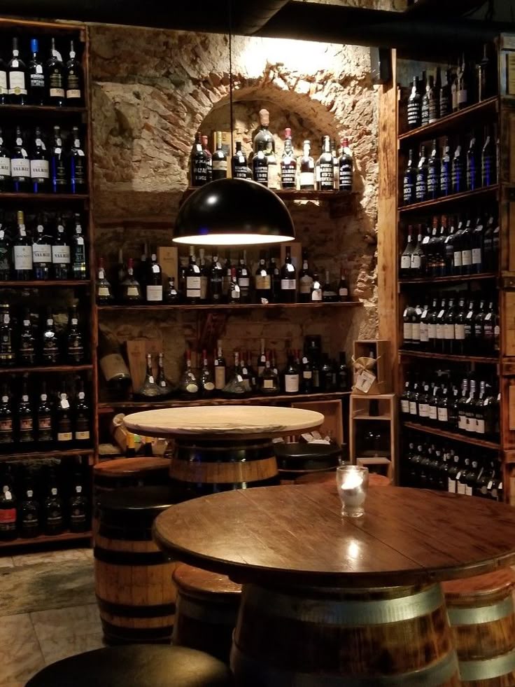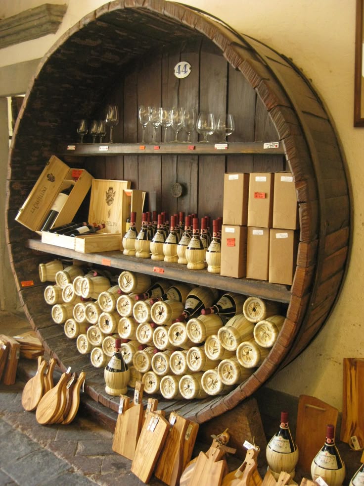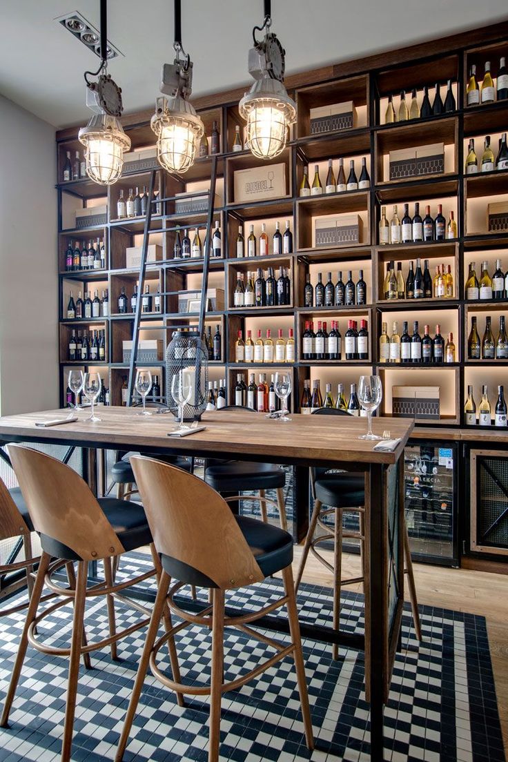 Kệ rượu: Tủ kệ gỗ tối màu (óc chó, sồi đen) với các ô vuông vừa một chai rượu. Kệ xếp chai nghiêng bằng gỗ. Khu vực tasting: Quầy bar dài bằng gỗ nguyên tấm, ghế bar cao bằng gỗ và kim loại.