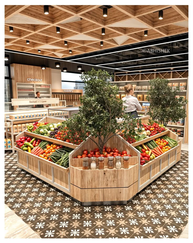 Mộc mạc, thân thiện, và gần gũi. Gỗ tạo cảm giác "farm-to-table" (từ nông trại đến bàn ăn), nhấn mạnh vào sản phẩm tươi ngon và tự nhiên.