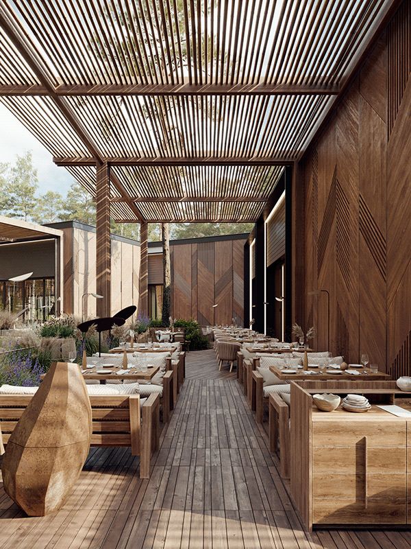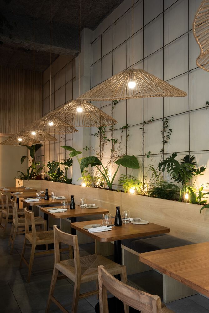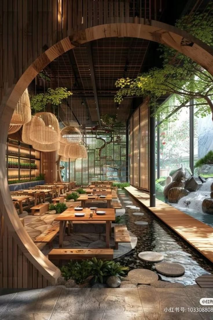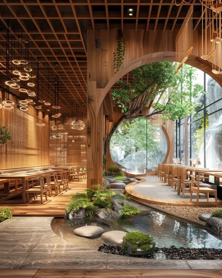 Sàn gỗ mờ, bàn thấp, vườn đá mini trong nhà. Cửa trượt bằng gỗ lồng mờ, không gian tĩnh lặng cho các bữa ăn thiền định.