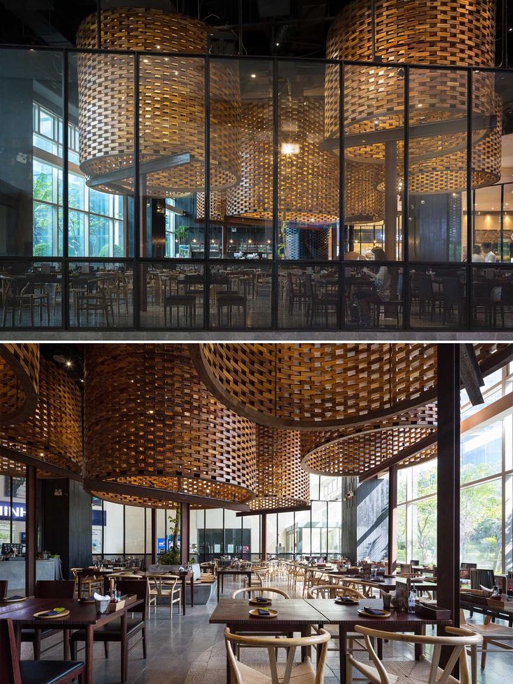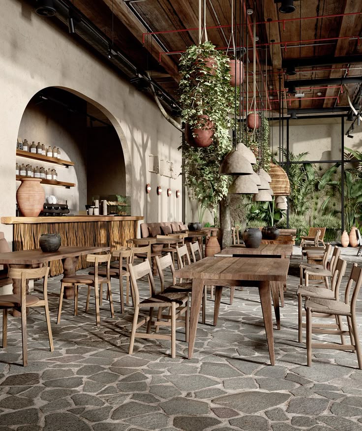 Kệ gỗ pallet kết hợp ống thép, bàn ăn dài bằng gỗ thô. Xe ngựa cũ biến thành quầy bar, đèn thả bằng chai thủy tinh.