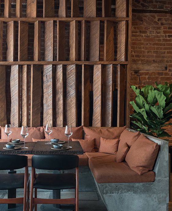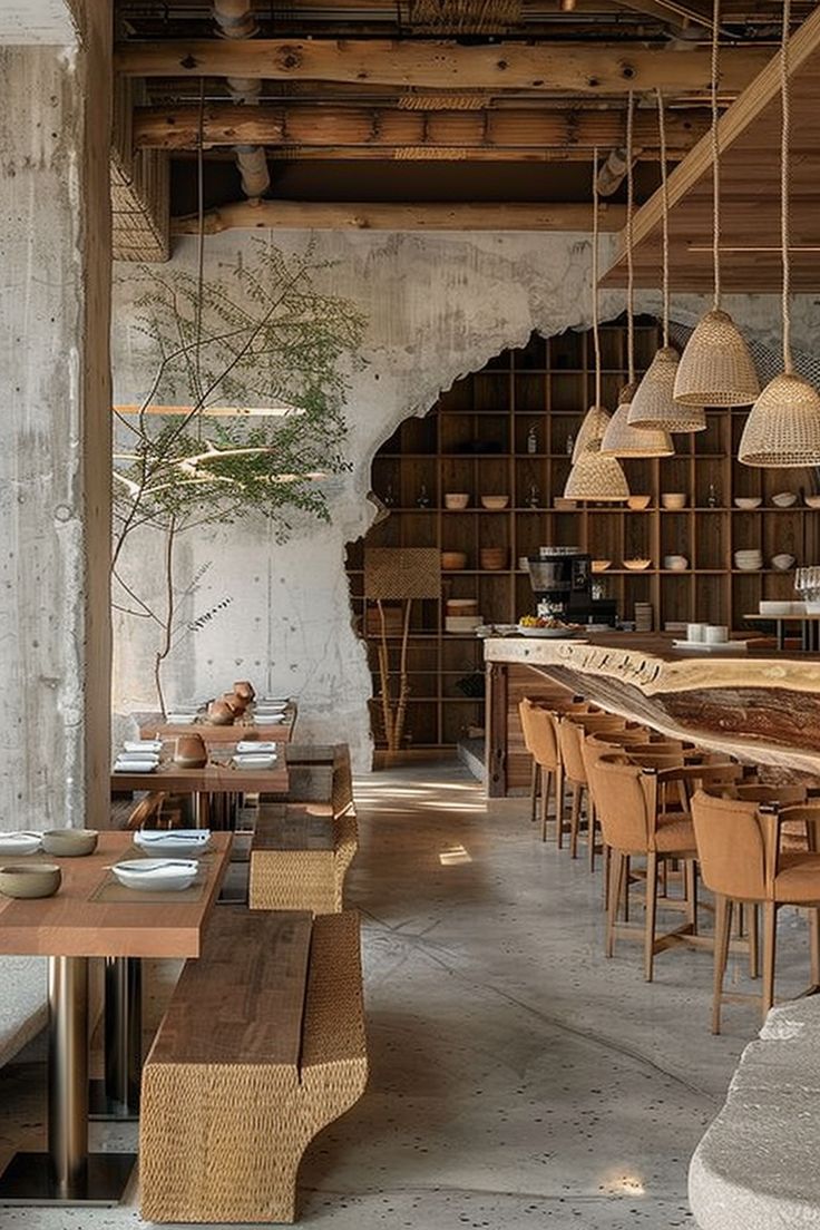 Quầy bar xi măng, ghế đẩu vinyl. Đèn treo, kệ gỗ, mang phong cách những năm 1950.