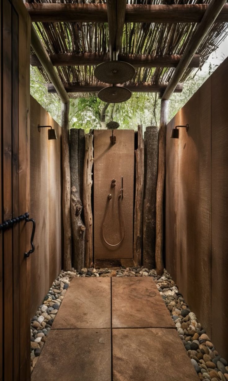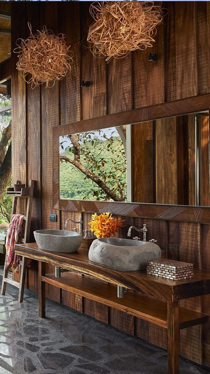 Vách ngăn phòng tắm bằng cây và ván gỗ lim chống ẩm. Kết hợp đá tự nhiên trên sàn, xung quanh là đá sỏi nhiều màu tạo sự tương phản hoàn hảo với vẻ ấm áp của gỗ.