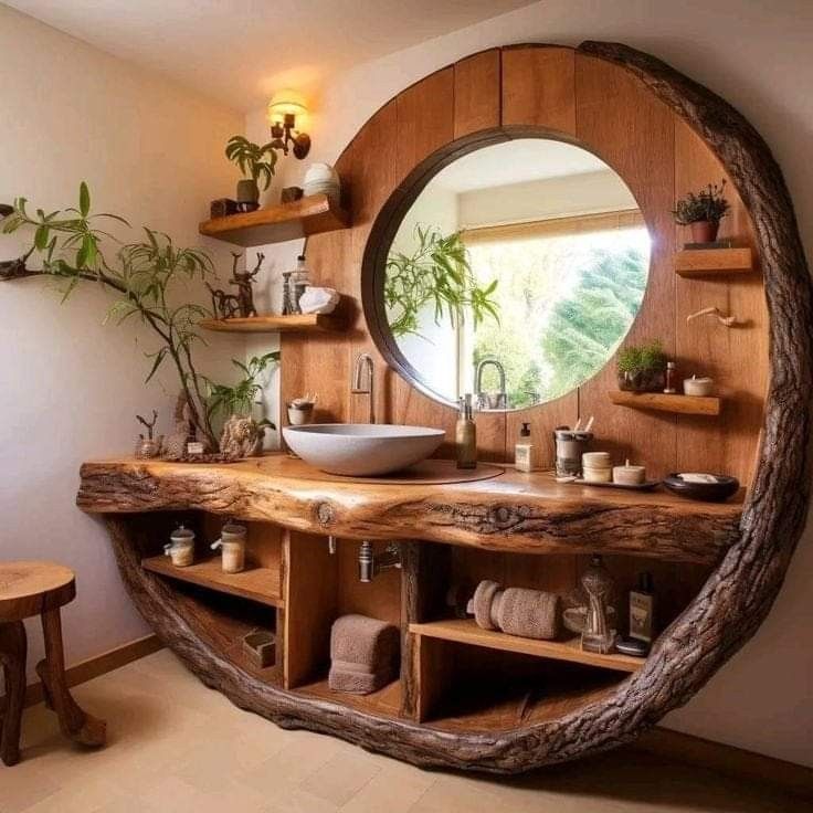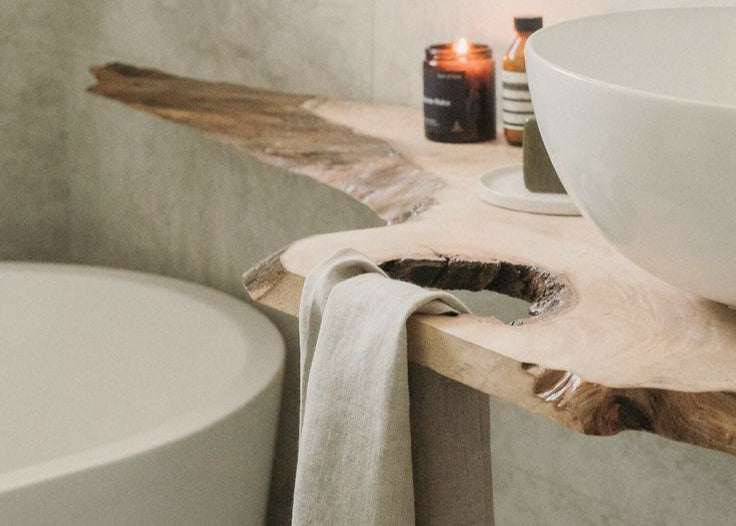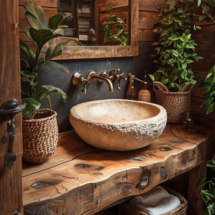 Bàn lavabo từ gỗ sồi nguyên khối, kết hợp bồn rửa bằng gỗ.