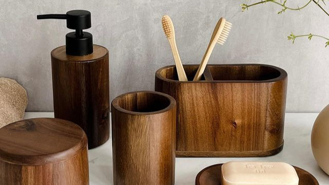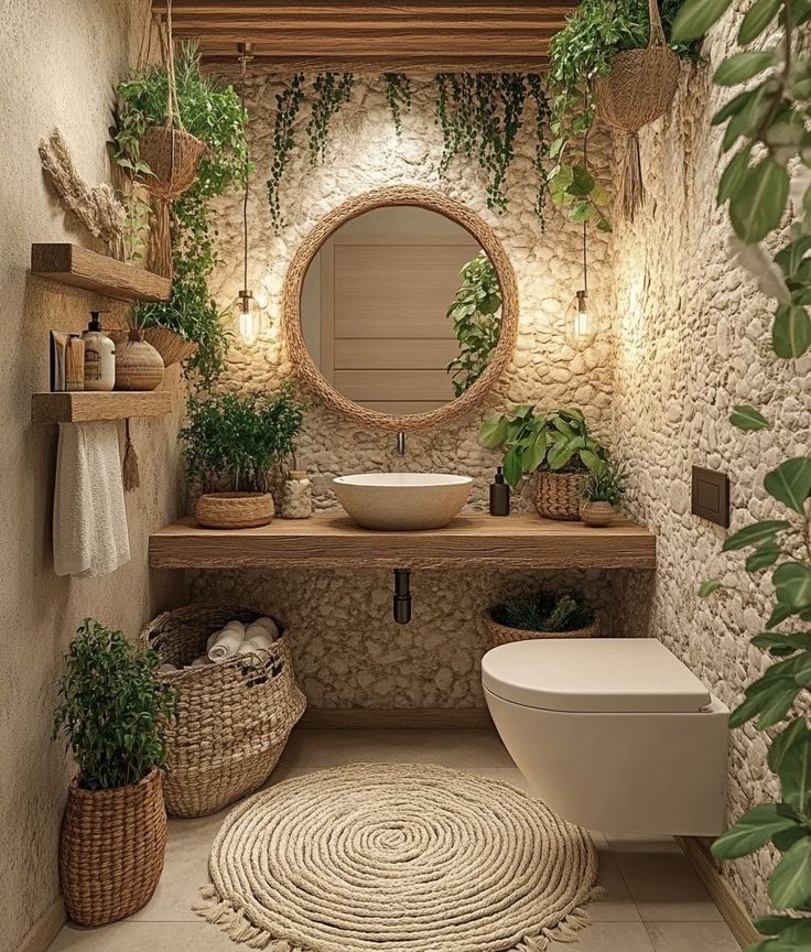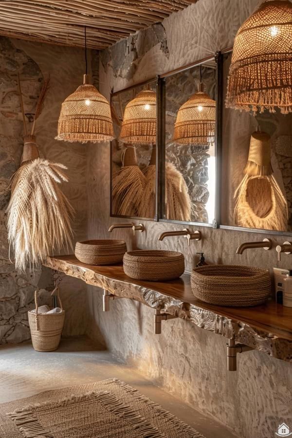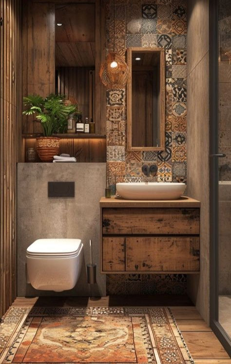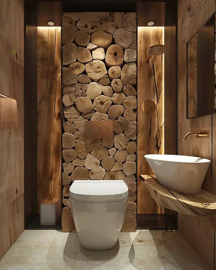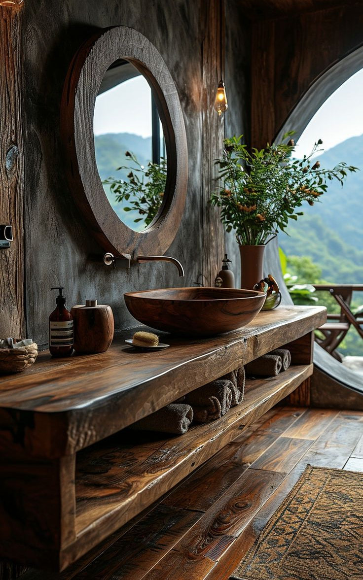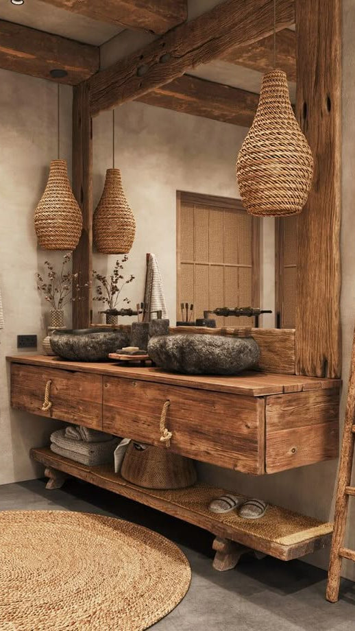 Phòng tắm với nội thất gỗ, khắc họa một không gian sang trọng, ấm cúng và gần gũi với thiên nhiên