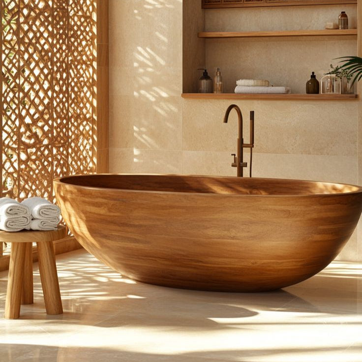 Bồn tắm gỗ tự nhiên đặt giữa phòng, tạo điểm nhấn ấn tượng với đường vân gỗ độc đáo.