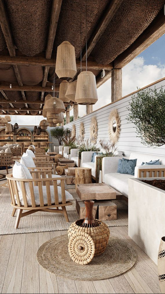 Nội thất gỗ tự nhiên, phối hợp cùng cây xanh và ánh sáng tự nhiên.